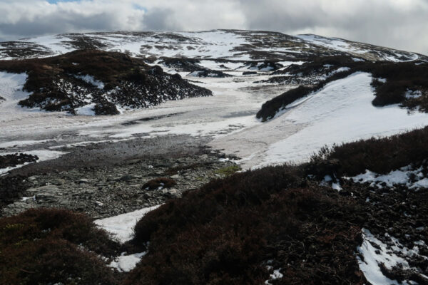 A landscape in miniature. Peat hags, snow, rock and heather high up on Auchnafree Hill, Perthshire